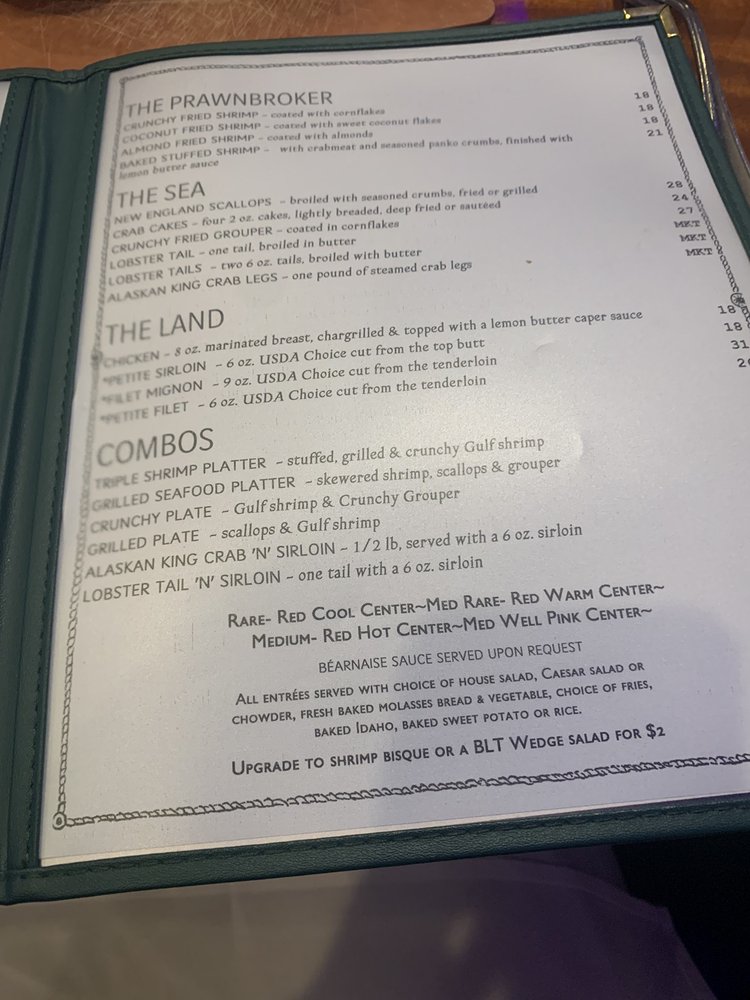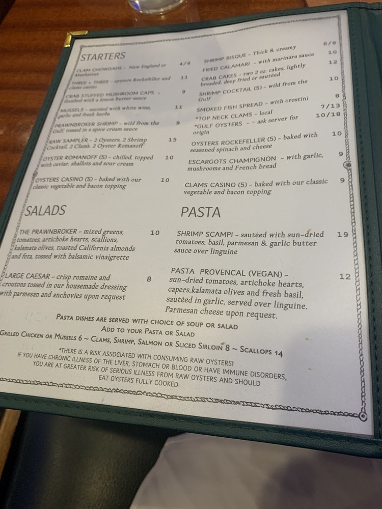 The Prawnbroker Restaurant & Fish Market is a seafood haven located in Fort Myers, FL, offering a variety of delectable dishes for seafood enthusiasts. From starters like Clam Chowdahs and Crab Cakes to salads featuring fresh ingredients like artichoke hearts and feta, the menu caters to all tastes. Pasta lovers can indulge in Shrimp Scampi or Pasta Provencal, while seafood platters like the Kings platter promise a delicious experience. Customer reviews rave about the tasty offerings, with highlights including the escargot and the fish entrees. The friendly service and relaxed setting add to the charm of this local favorite. For a genuine seafood dining experience in a welcoming atmosphere, The Prawnbroker is the place to visit.